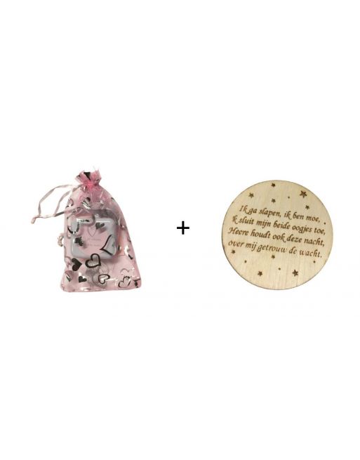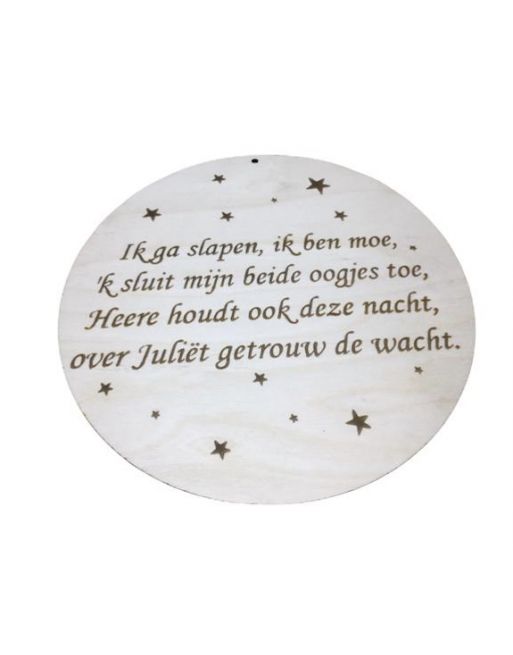 Een mooie houten schijf met het bekende lied: 'ik ga slapen, ik ben moe'.