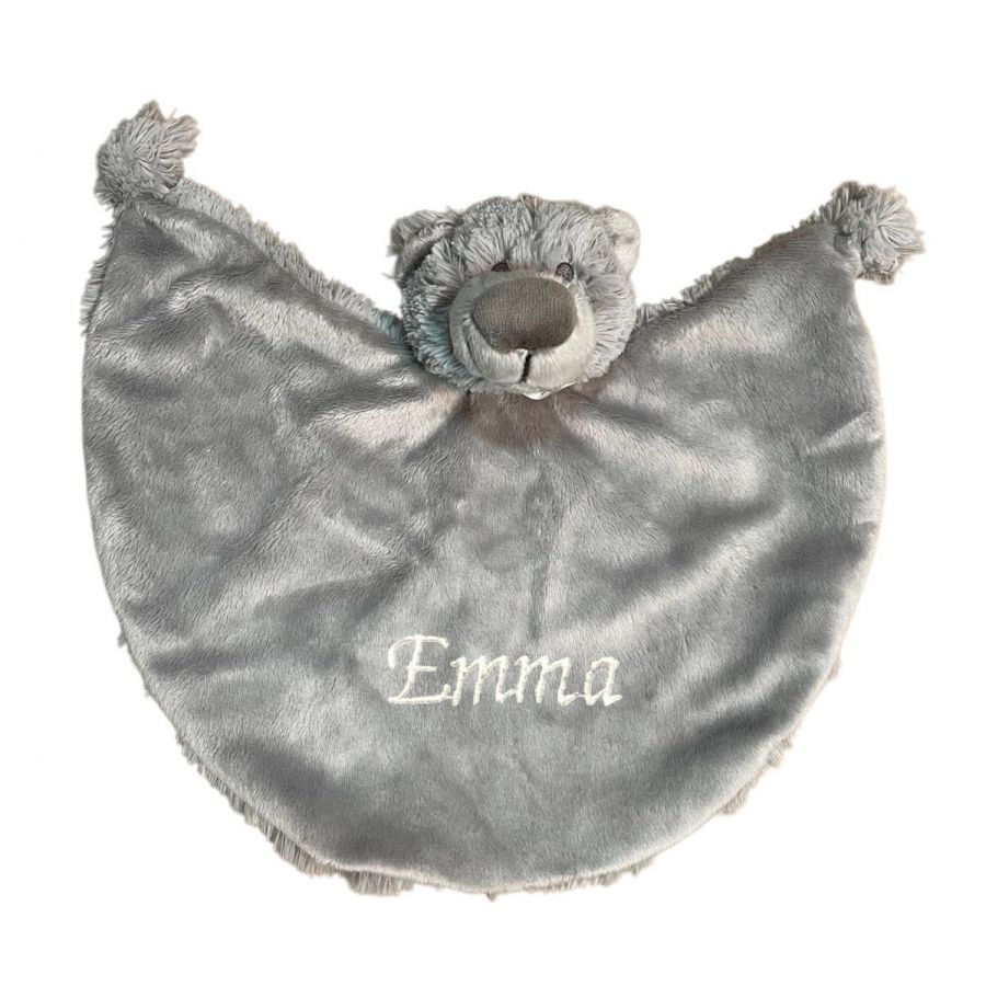 LET OP: Het bedrukbaar gebied is 6,5 cm. Hoe langer de naam, hoe 'kleiner' het wordt. Denk hierbij goed na welk lettertype u kiest. Het borduursel is aan de achterkant van het knuffeldoekje te zien.