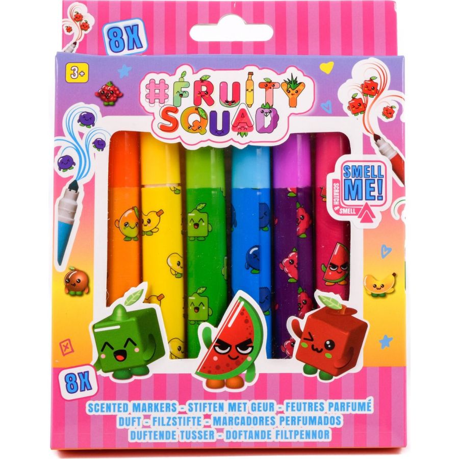 Met de kleurrijke en geurrijke stiften van Fruitysquad maak je te gekke tekeningen die heerlijk ruiken. Samen met je vrienden kan je de coolste tekeningen maken. Combineer de verschillende kleuren om een echt meesterwerk te maken. Wat voor tekening ga jij maken? Gebruik je fantasie om de mooiste kunstwerken te maken. Maak een tekening met de lekkerste zoete geuren voor je vrienden of familie. De stiften bevatten de geuren van heerlijke fruitsoorten zoals bijvoorbeeld bosbessen, aardbeien en kersen. De set bevat acht stiften met brede punt met geur. Wordt in windowbox geleverd in display van 6 stuks. Geschikt voor kinderen vanaf 3 jaar.