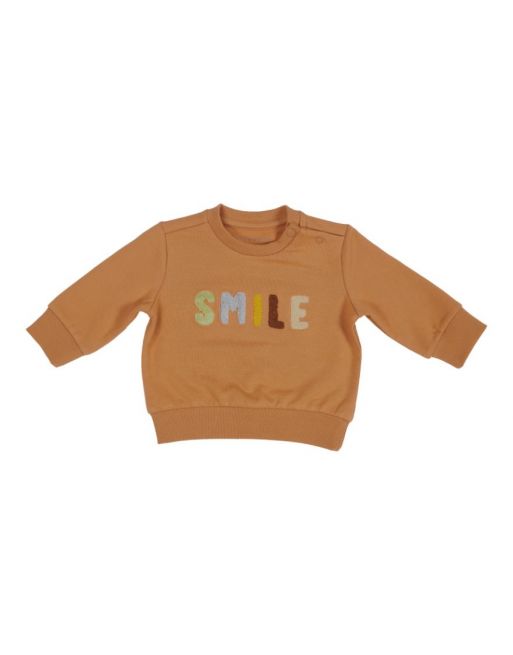 Smile! Deze leuke trui in maat 50/56 met de tekst ‘smile’ op de voorkant in teddy stof tovert zeker een lach op ieders gezicht. Het kledingstuk heeft een opening op de schouder die is vastgezet met twee drukknoopjes. Dit vergemakkelijkt het aan- en uitdoen. Gemaakt van gecertificeerd biologisch katoen dat vrij is van schadelijke stoffen. Verkrijgbaar in de maten 50/56, 62, 68, 74, 80 en 86.