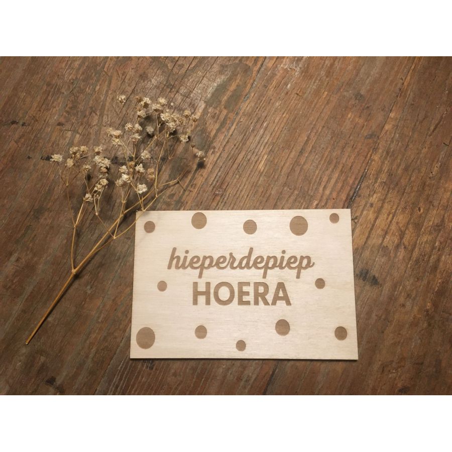 Een houten kaart, met de tekst 'hieperdepiep hoera'. De kaart is gemaakt van 3mm berkenhout en een uniek product! De kaart is 10x15 cm. Op de achterkant kan gewoon met pen geschreven worden.
